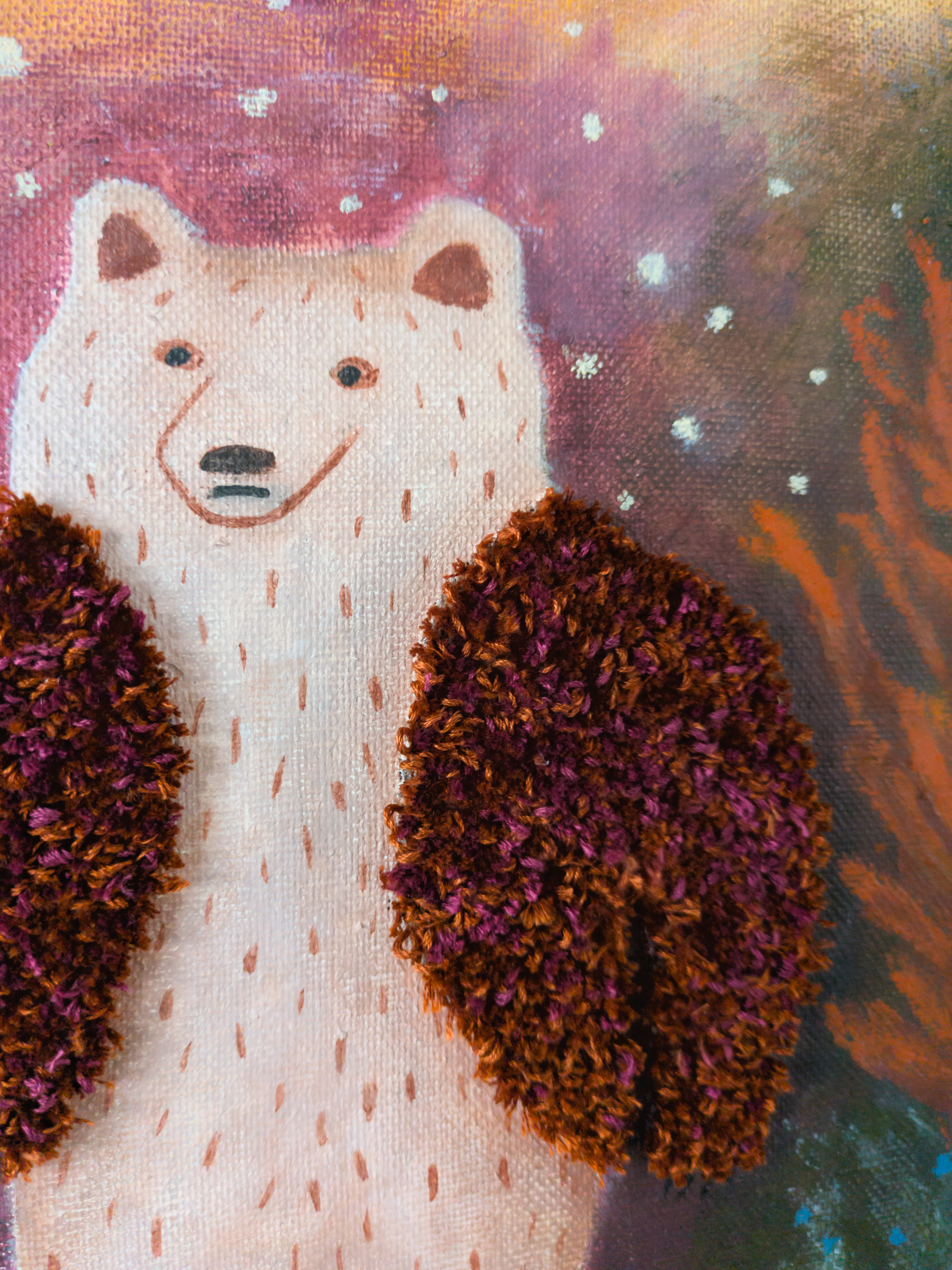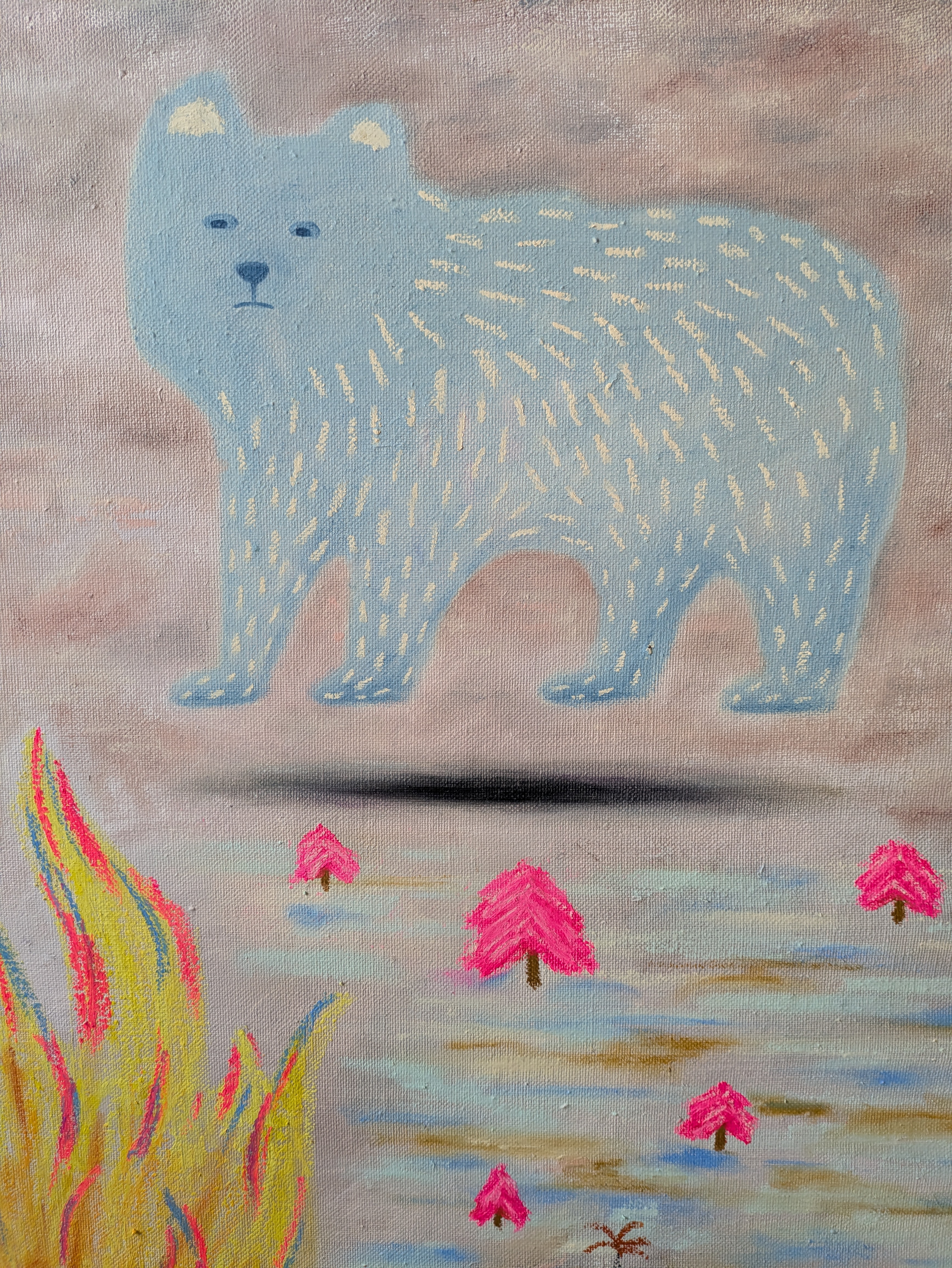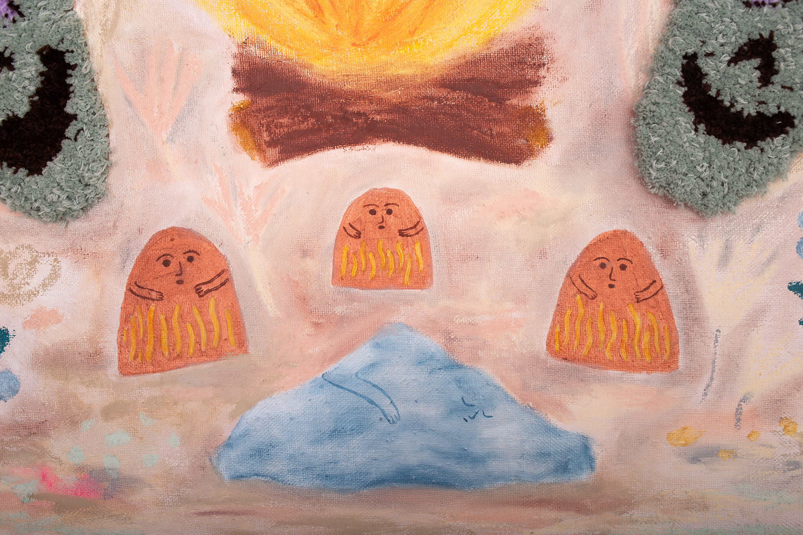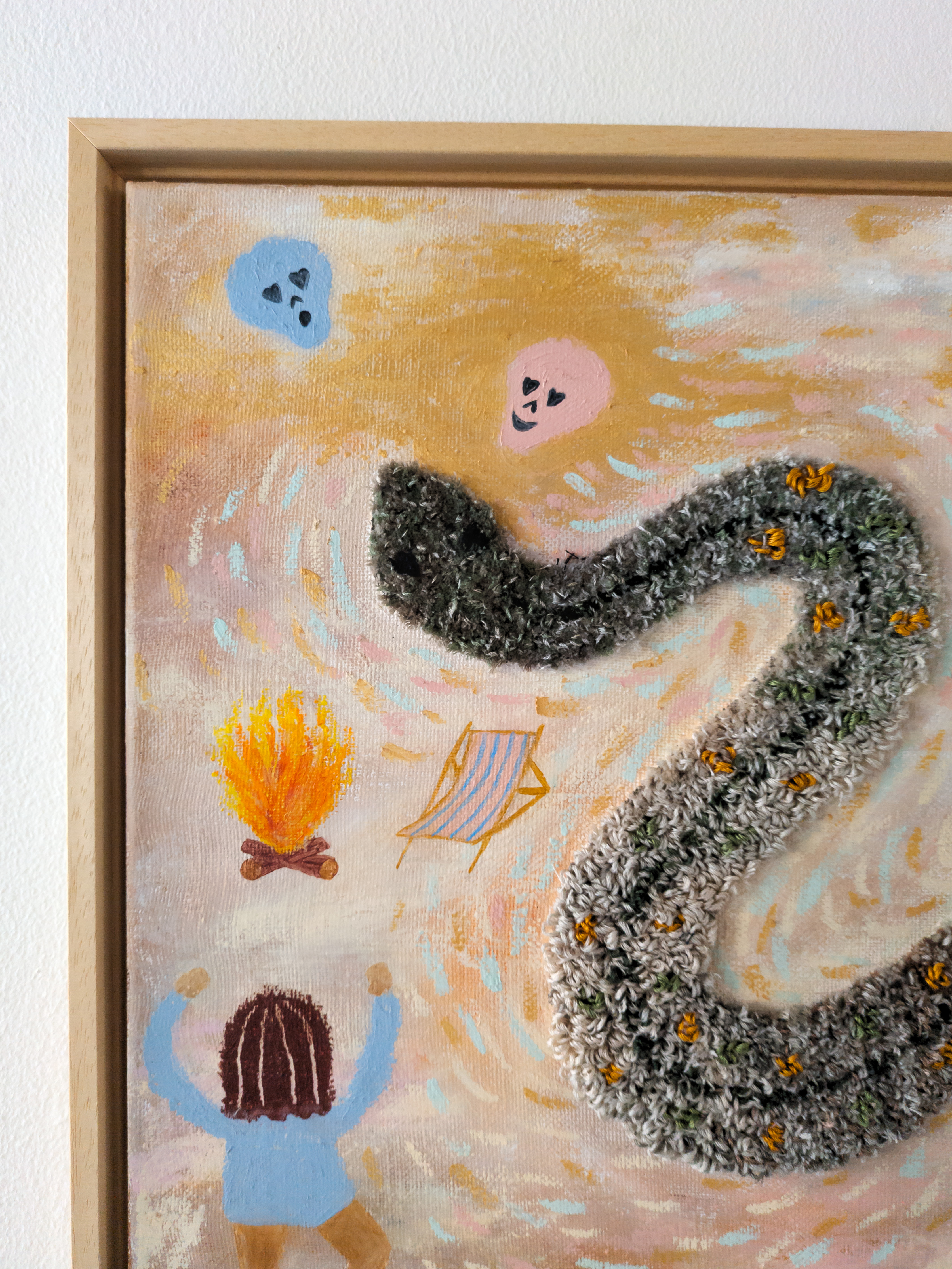 My works in this show move between playfulness and quiet unease, with layered surfaces, symbolic figures, and embroidered elements that hint at open-ended narratives. I like when things feel slightly off – like a memory or a dream that doesn’t fully settle.